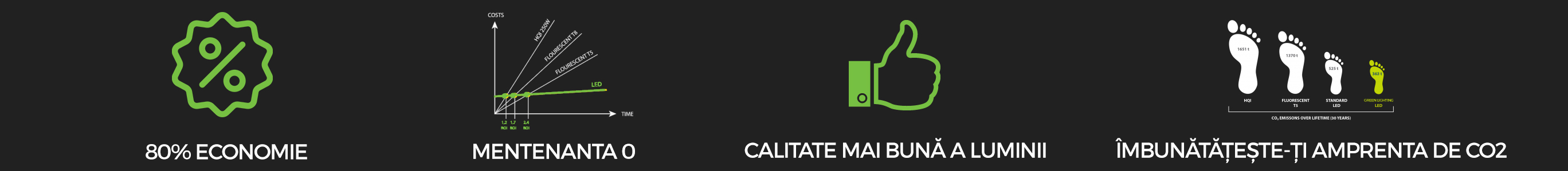 Datorită calității superioare a componentelor integrate într-un sistem inteligent de iluminare LED Green Lighting, întreținerea este un lucru trecut. Fiabilitatea și durabilitatea produselor vă permit să reduceți costurile de întreținere ale noului dvs. sistem de iluminare.